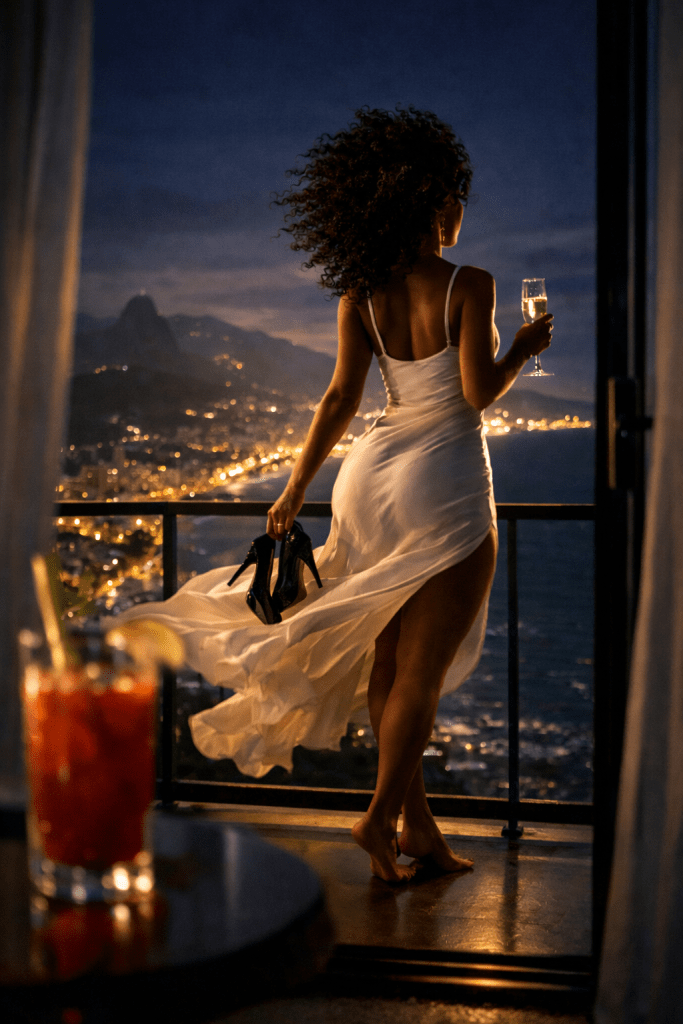 Alguém passou por mim em silêncio e abriu alguma porta para a sacada. Bebo mais um gole do meu Bloddy Mary e procuro curioso pela pessoa do outro lado do vidro. Um vestido de um branco que absorve cores ao redor cobre o corpo de uma mulher esbelta e ágil como um felino. Ela tira os saltos. Segura-os com uma mão e enquanto tem na outra uma taça de champagne. O vento castiga o vestido contra o corpo dela. Silhueta desenhada pelo sopro da noite. Observo em surdina essa beleza inesperada. Solidão graciosa de uma menina leopardo. Cansada da farra? Enjoada das cantadas previsíveis dos pit-boys? O olhar se perde no horizonte. O vento insiste em castigar seu vestido. Levanta-o sem cerimonia. Uau! Vejo bem mais do que imaginaria. Seu bumbum fica exposto por longos segundos. Ela não usa calcinha alguma. Bunda volumosa, morena. Sou tomado por arrepio na espinha. Ela continua com o olhar pensativo, perdido no horizonte. Não se importa que o vento a desnude.